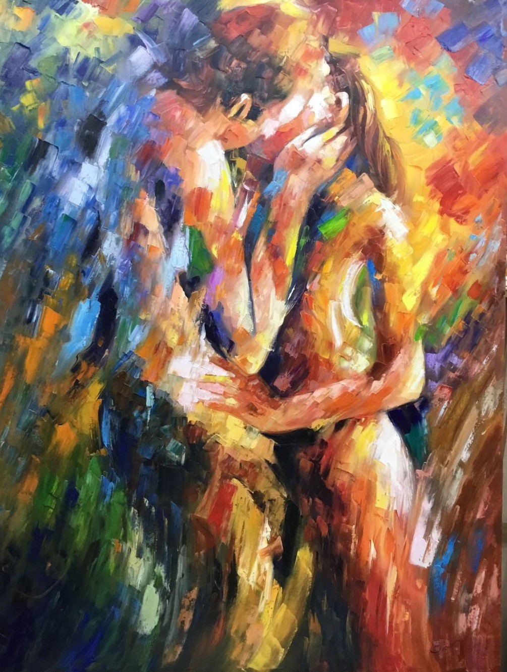 Abstract painting of boy and girl kissing with heavy brush strokes – bold, expressive modern wall art full of passion and texture.