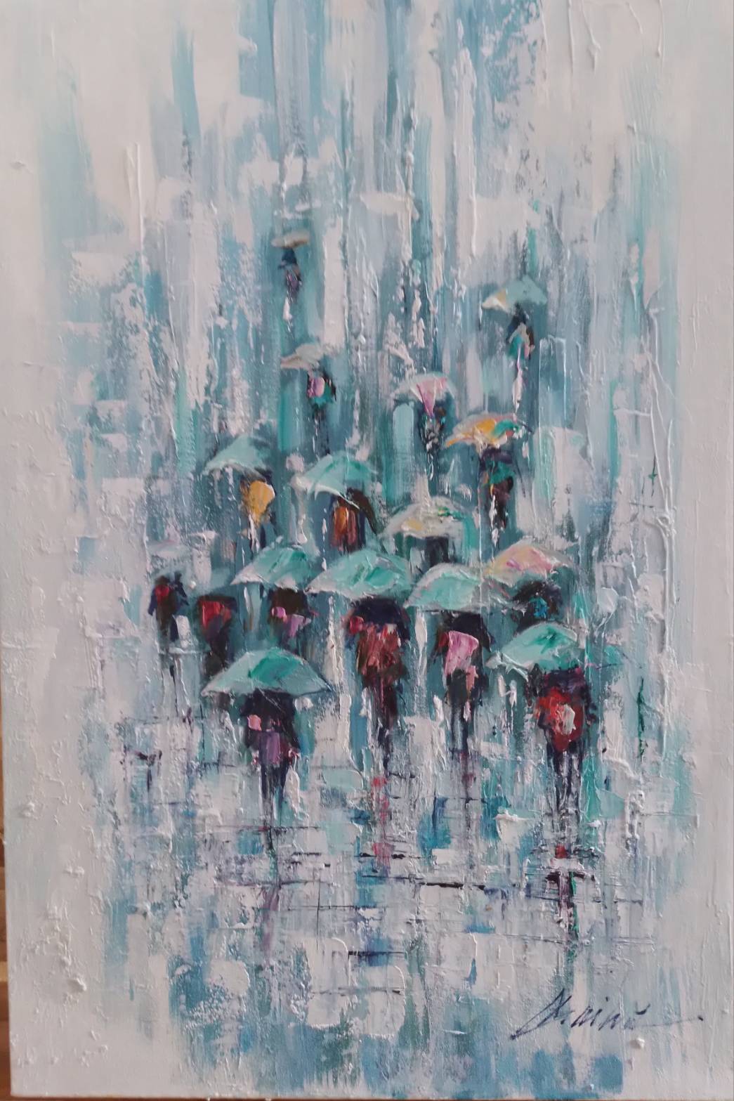 Abstract painting of people with umbrellas in cold tones – modern, atmospheric wall art with cool blues and greys for contemporary interiors.