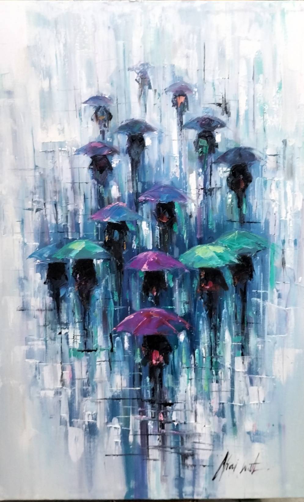 Abstract painting of people holding umbrellas in cool, muted tones captures the quiet beauty of a rainy day