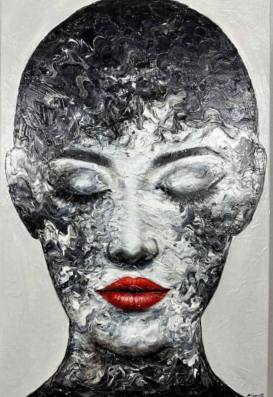 A serene and calm representation of a lady’s face, rendered in deep black tones