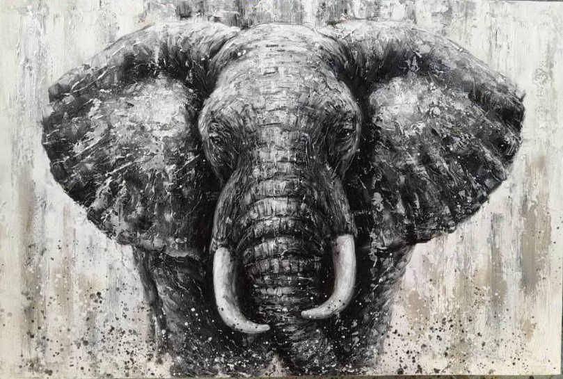 This striking painting captures the majestic presence of an elephant in a minimalist black and white palette.