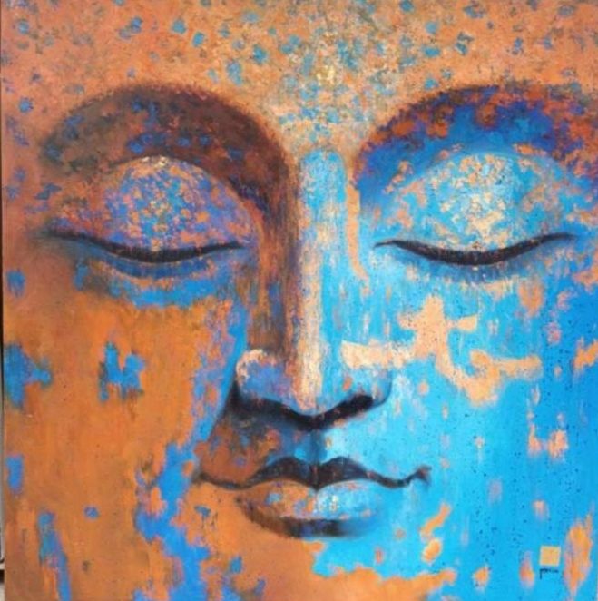 Bring harmony and tranquility to your space with this blue and brown Buddha face painting, beautifully blending calming blue hues with warm earthy browns