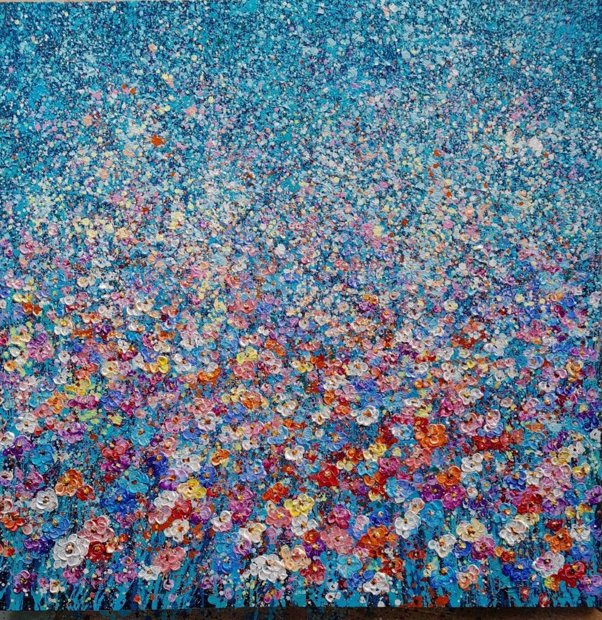 A charming abstract representation of a small flower garden, set against a serene blue background. Delicate blooms in vibrant colors—pinks, yellows, and purples