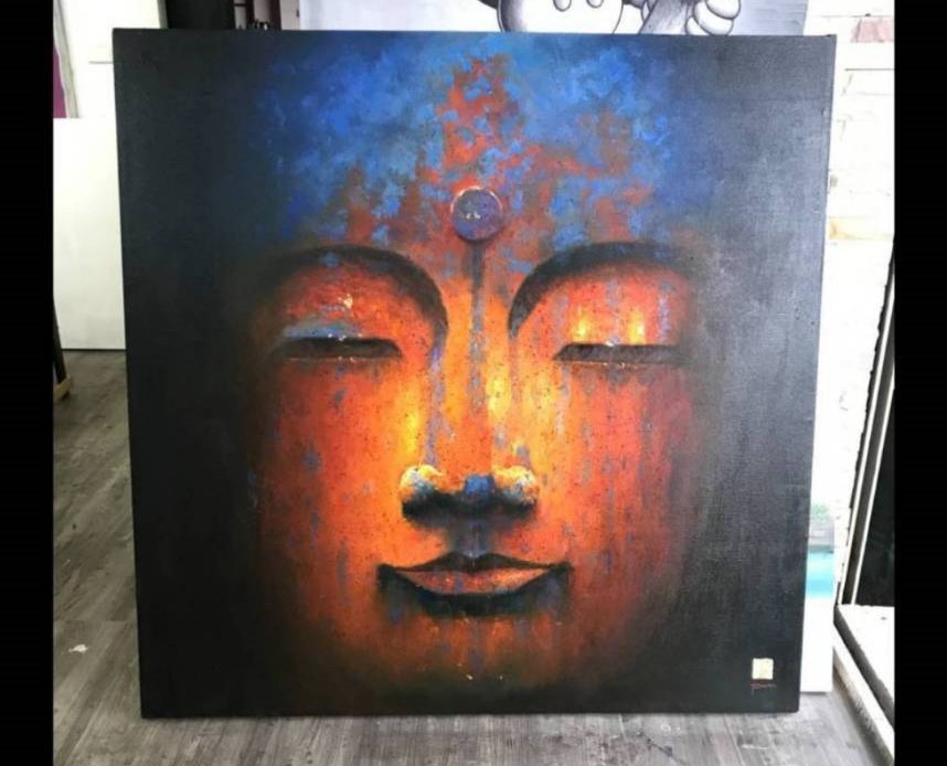 Bring depth and tranquility to your home with this dark blue and brown Buddha painting, a harmonious blend of rich earthy and calming deep blue tones