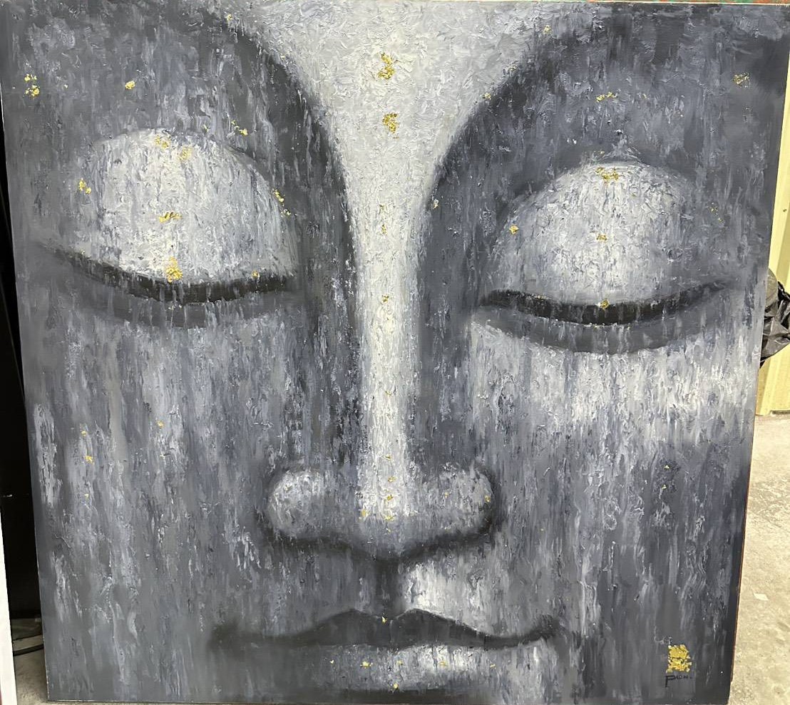 Featuring soft, shadowed tones of charcoal and slate, this Buddha portrait evokes tranquility and inner stillness.