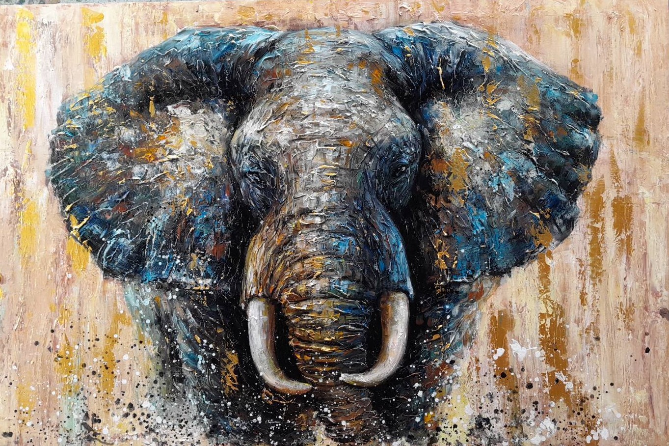 This elegant painting showcases a graceful elephant against a warm beige backdrop, creating a sense of calm and sophistication.