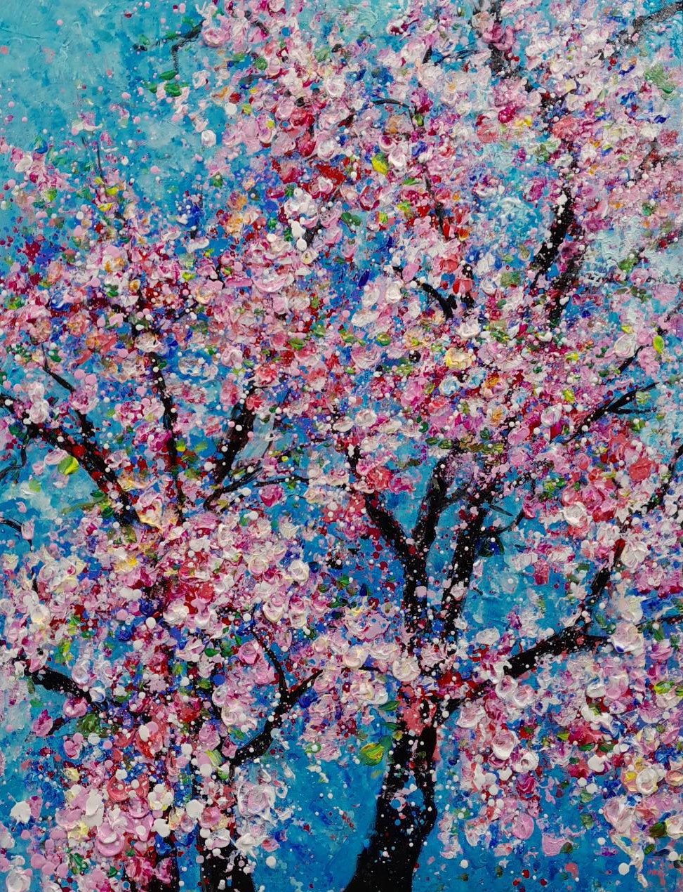 A striking abstract composition featuring dabs of pink that come together to form the silhouette of a tree