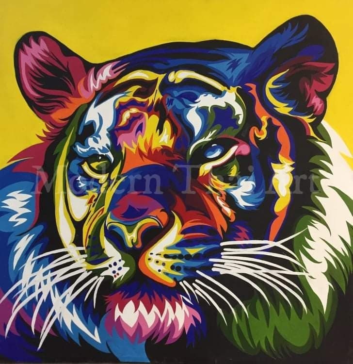 Colorful tiger painting on yellow background vibrant animal wall art symbolizing power, energy, and courage for bold and modern interiors.