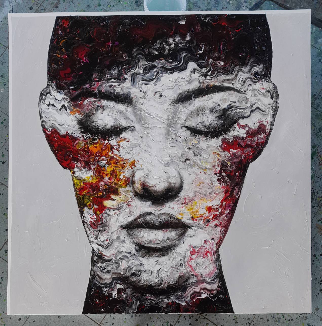 Make a striking statement with this red, black, and white lady face abstract painting, where bold contrasts and dynamic brushstrokes combine to capture fierce emotion and modern femininity.
