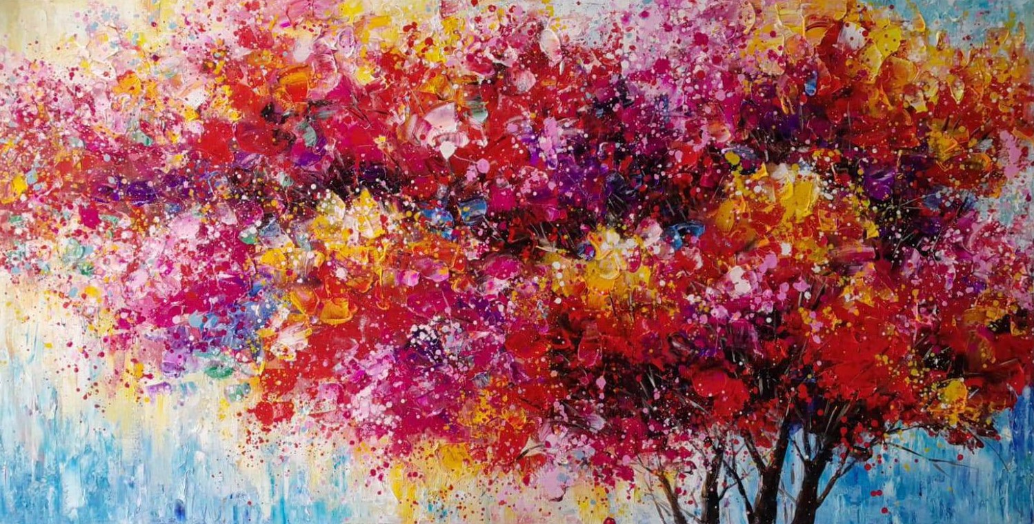 An abstract representation of a red tree, characterized by bold and striking forms