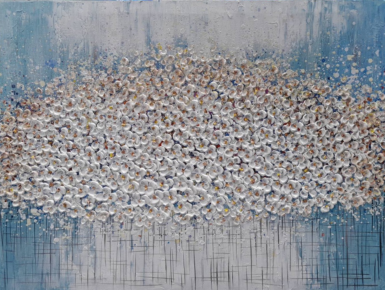 Delicate small white flowers set against a serene blue background.
