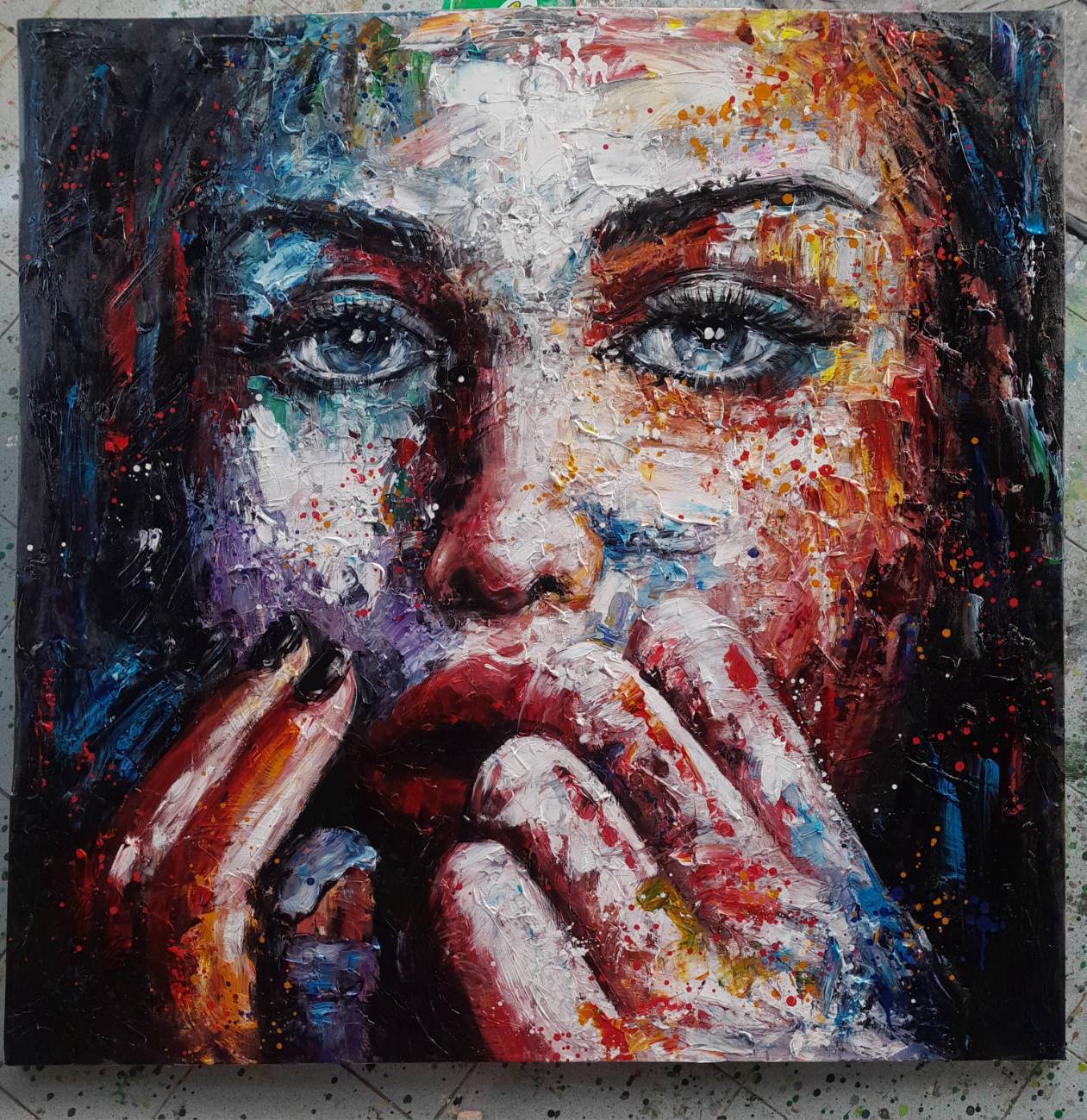 The painting blends vibrant colors and artistic enerygy, aiming to evoke a sense of creative thought