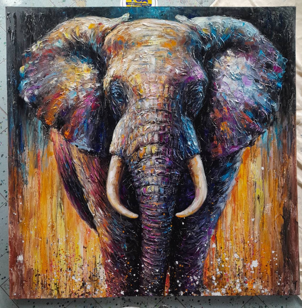 This striking painting captures the essence of a powerful elephant set against a backdrop of warm hues