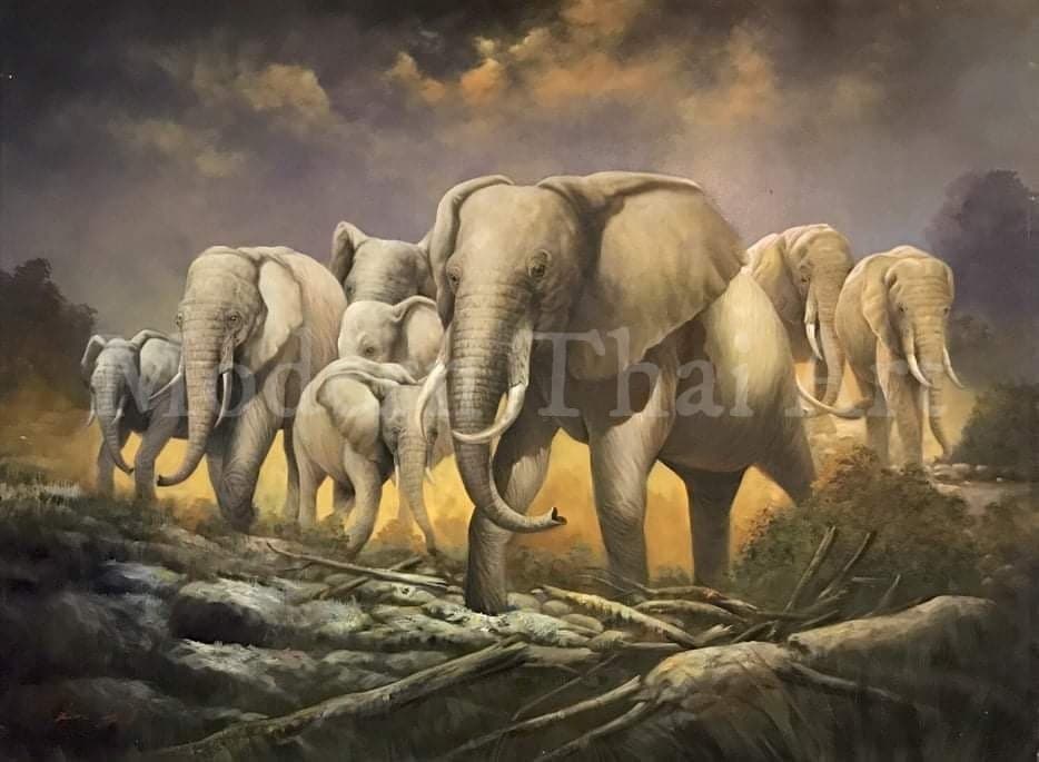 Painting of a large elephant tribe majestic animal wall art symbolizing unity, protection, and the power of community in natures wilderness.