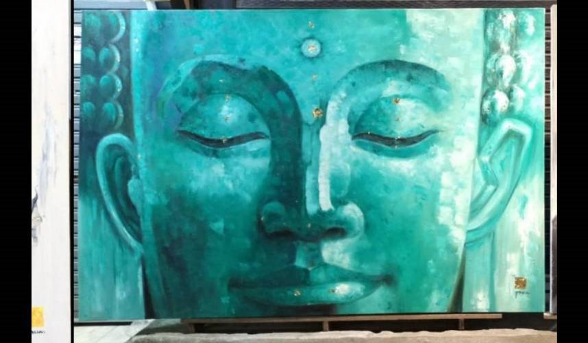 Add a soothing touch to your space with this turquoise Buddha face painting, featuring serene blue-green hues that symbolize healing, tranquility, and spiritual balance