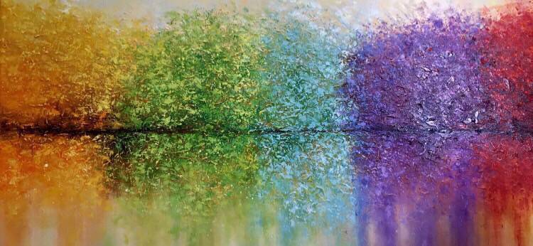 Colorful abstract painting in orange, green, light blue, purple, and red – vibrant modern wall art full of energy and expression.